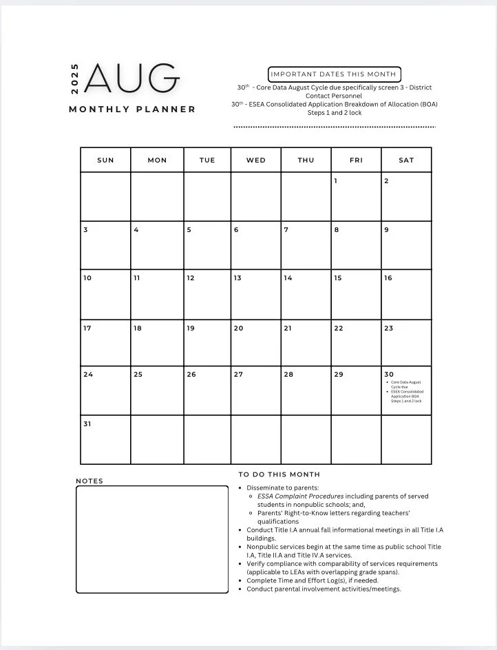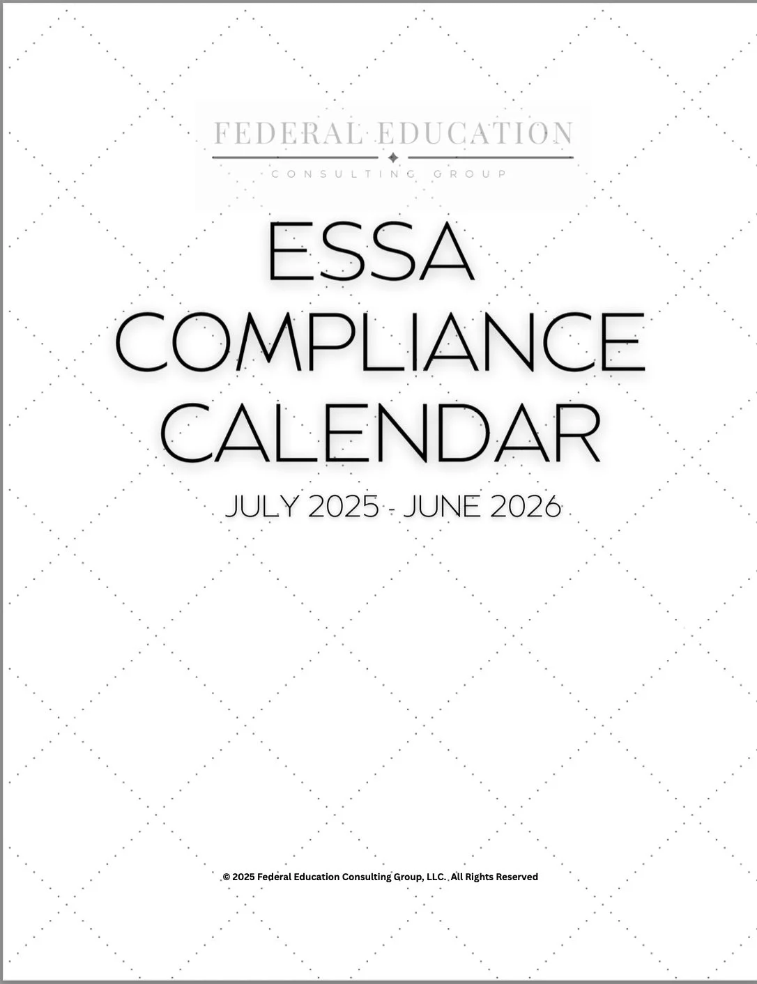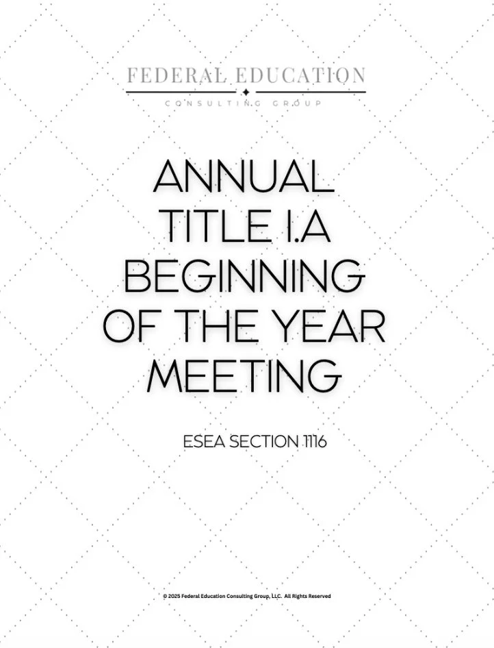 Store Quick View Required Meetings Checklist $10.00 Add To Cart Added! Quick View Annual Title I.A Beginning of the Year Meeting $15.00 Add To Cart Added! Quick View ESSA Compliance Calendar 2025-2026 Edition $25.00 Add To Cart Added!